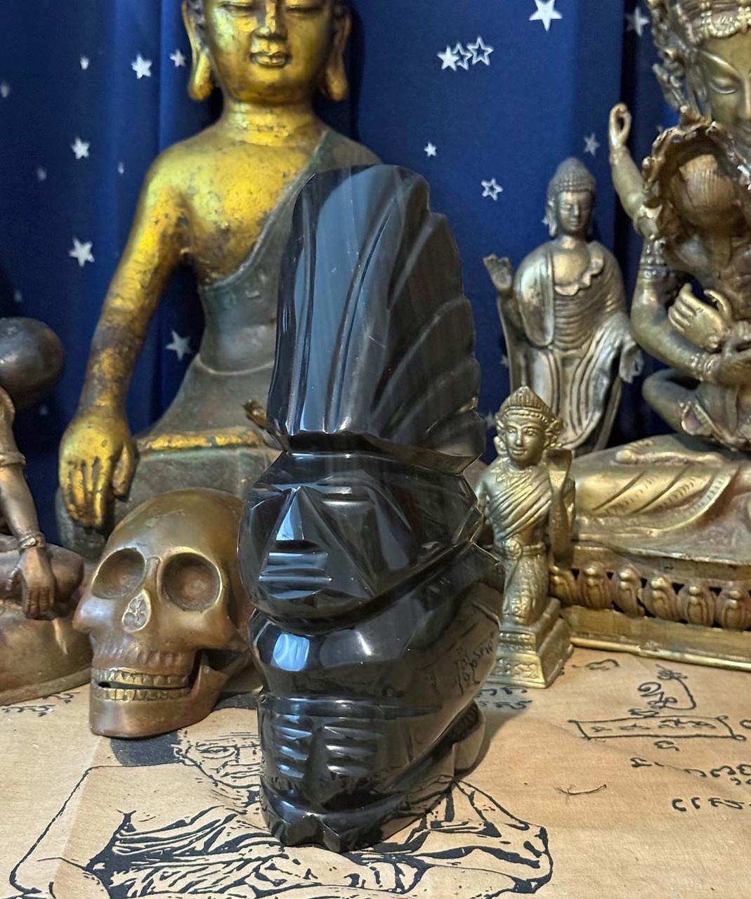 Twenty-four years have now passed since we were called to do the estate that had been closed up for seventeen years! The Voodoo Estate!Some Back Story Found buried in a pile of jewelry on the Main Altar in the Main Ballroom, which was the largest if not the most ornate of all the altars in this estate. It was here in the Main Ballroom that the large ceremonial gatherings took place. There is no inventory or journal mention of this carving that we have been able to cross reference and attribute. This is not unusual as our own attempts at inventory, identification and attributing the items found at this altar has proven to be a monumental task. There were piles of items that had apparently been tossed at altar and left to accumulate over the years. We literally had to shovel them up in some areas to cart them out of there. Most of these items have gone unattributed due to lack of mention in her journals and inventories. We believe the carving was most likely a gift offering, brought by a visiting practitioner that was placed at this altar, as indicated by those items that we have been able to attribute. The Guest Book to this altar room has thousands of entries which read like a who's who of metaphysical practitioners, dating back to 1910 with a total of 6842 from 1979 to the ninety days following her death. Silver Sheen Obsidian Obsidian was no stranger to those associated with this estate as shown in the many entries in there journals concerning it. Some of these entires claim, "it will fulfill your hunger and provide an abundance of what is necessary."
