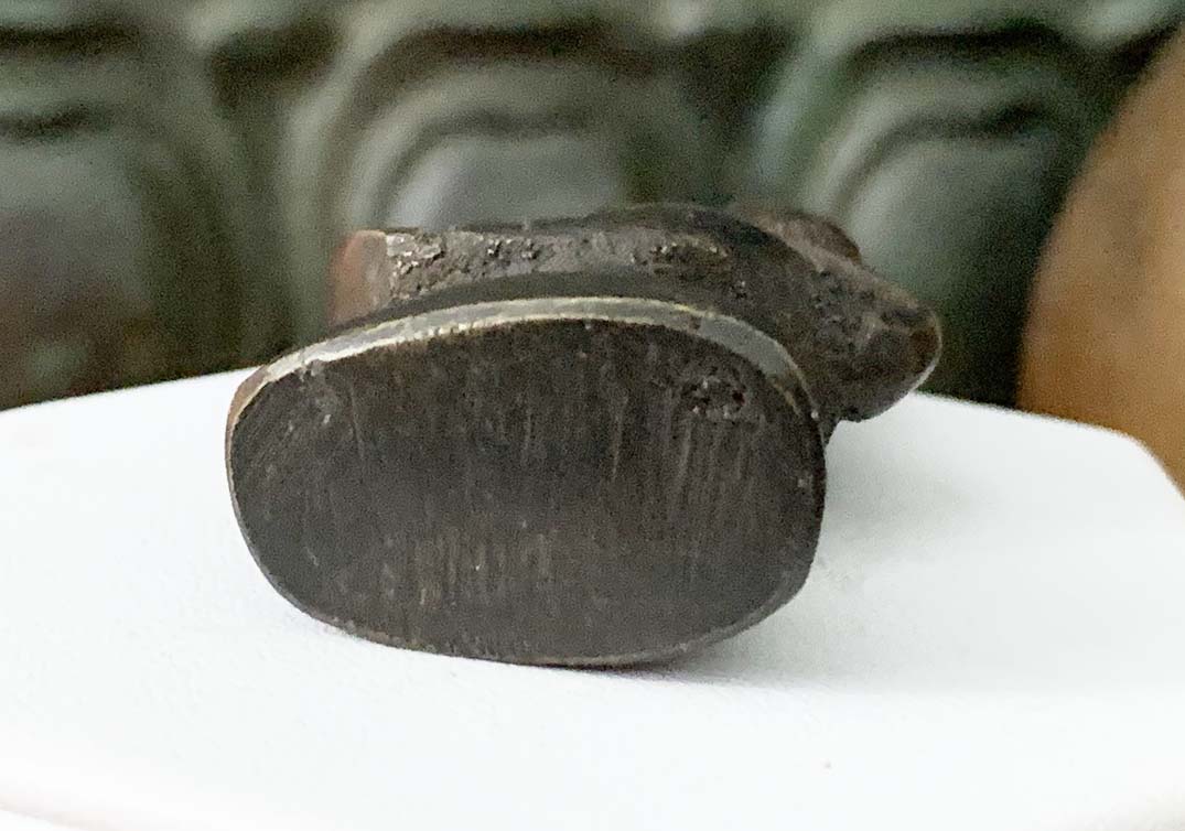 Unmarked, it displays a bit of a brutalist design and has achieved a well worn patina from over a hundred years of handling. It measures approximately 1 9/16" x 1" x 5/8" and weighs 40.7 grams.