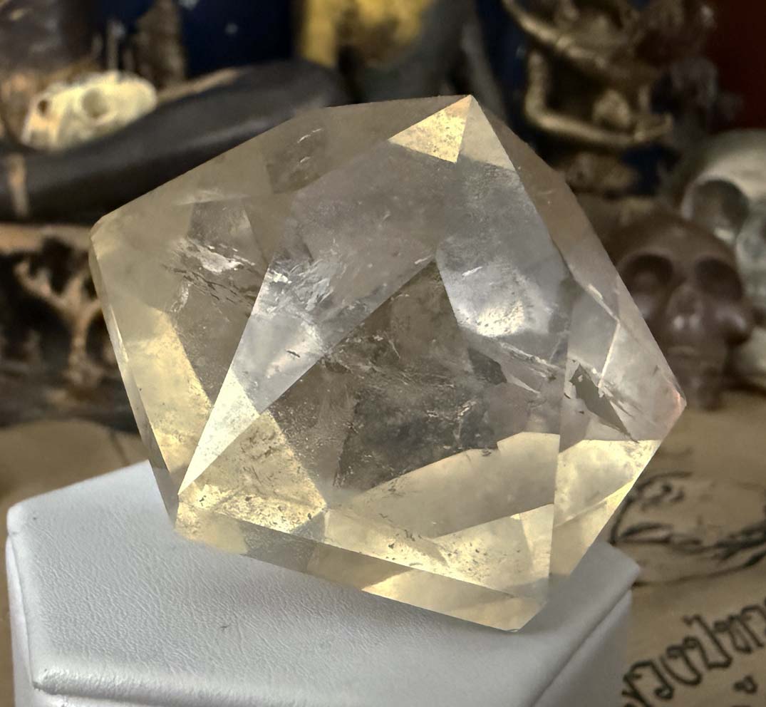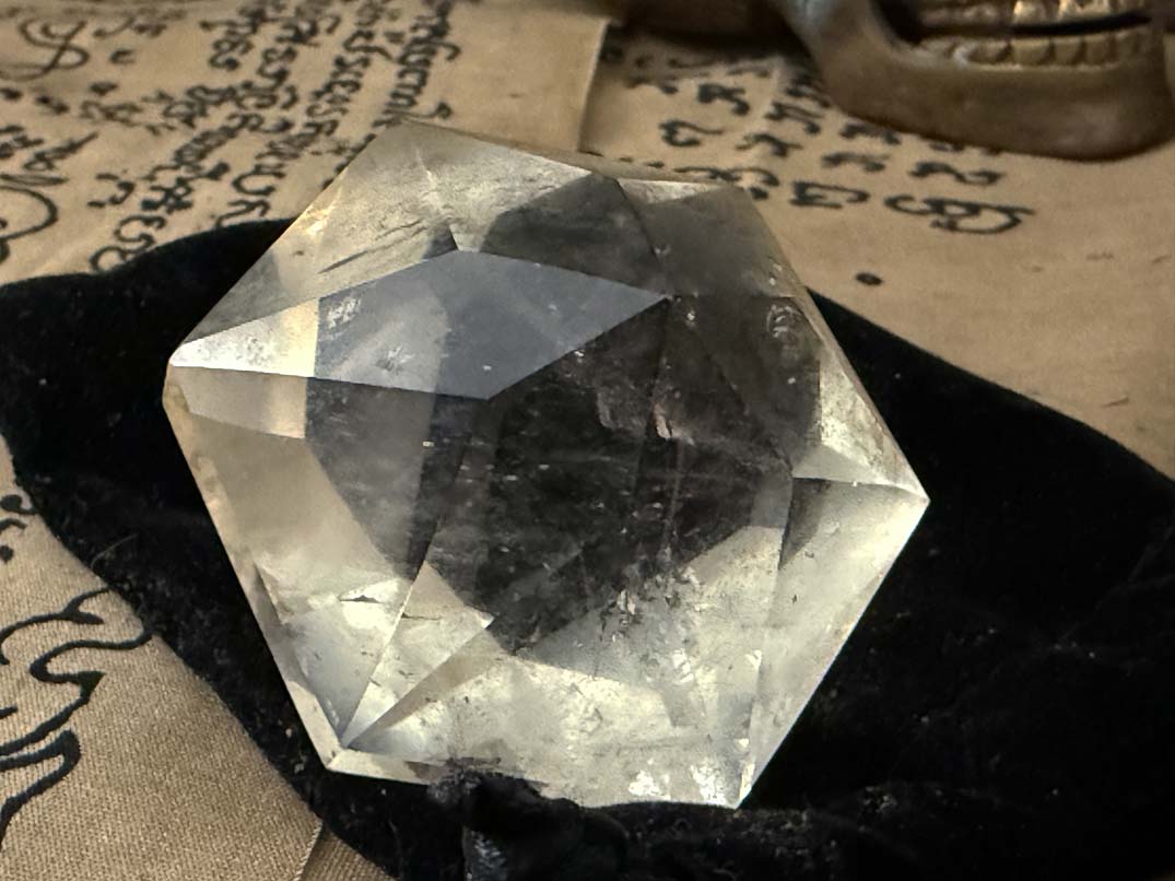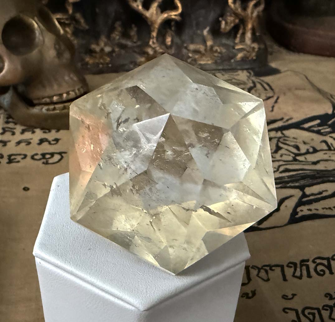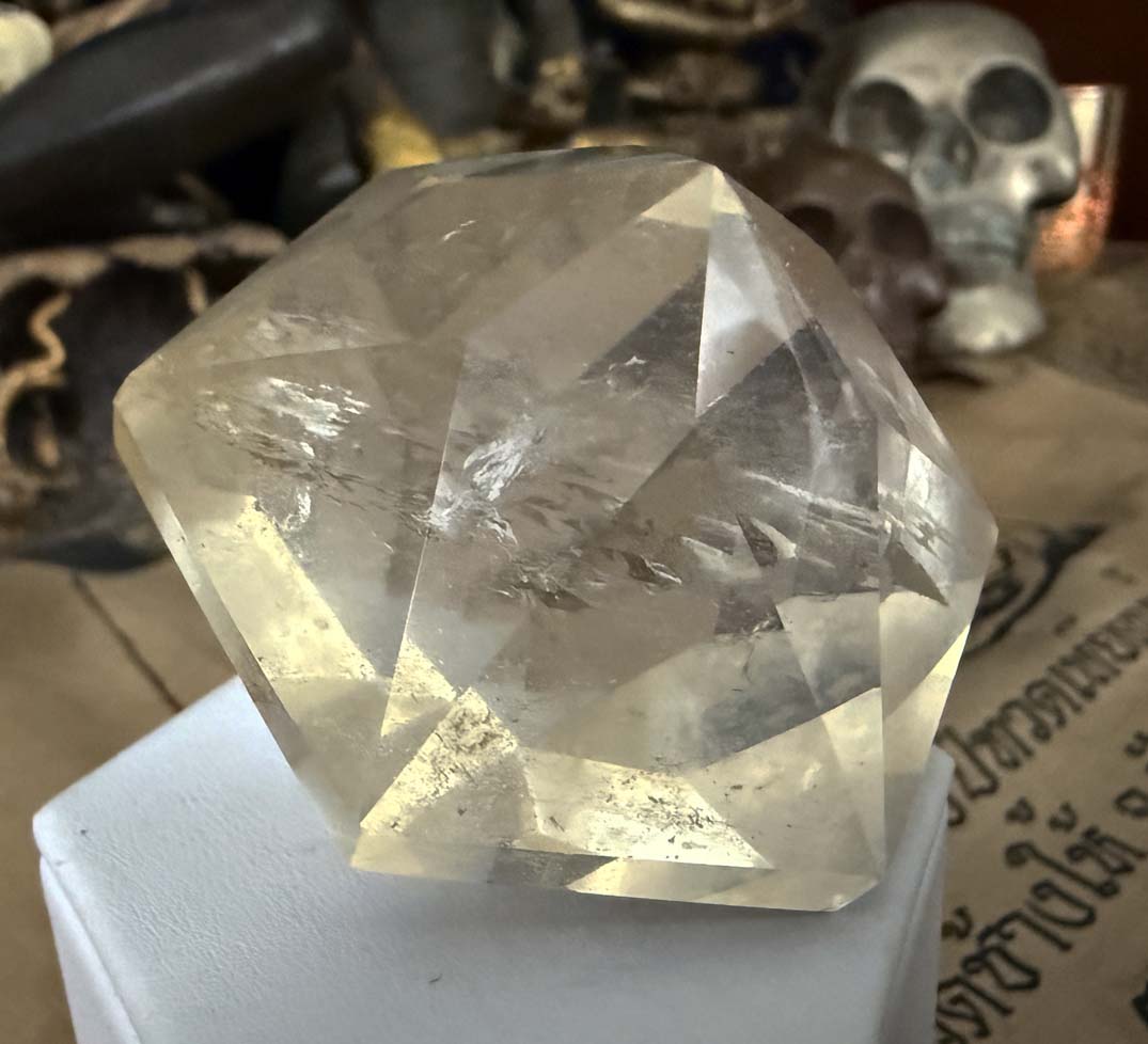 Examination reveals an unusual 58.7375 x 58.7375 x 50.8 mm, 835.94 ct., faceted hexagonal dipyramid rock quartz crystal gem which displays phantom cluster veil inclusions and 92% clarity throughout.The angles of the crystal faces of this formation are those of a generator or Merlin crystal as the energy emits from its centrally located points which are in excellent condition.
