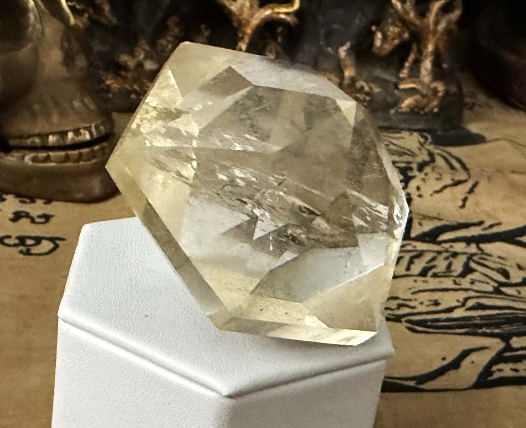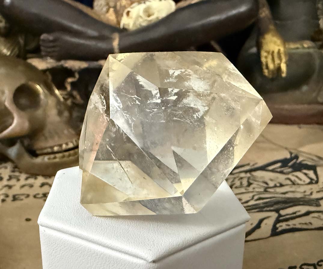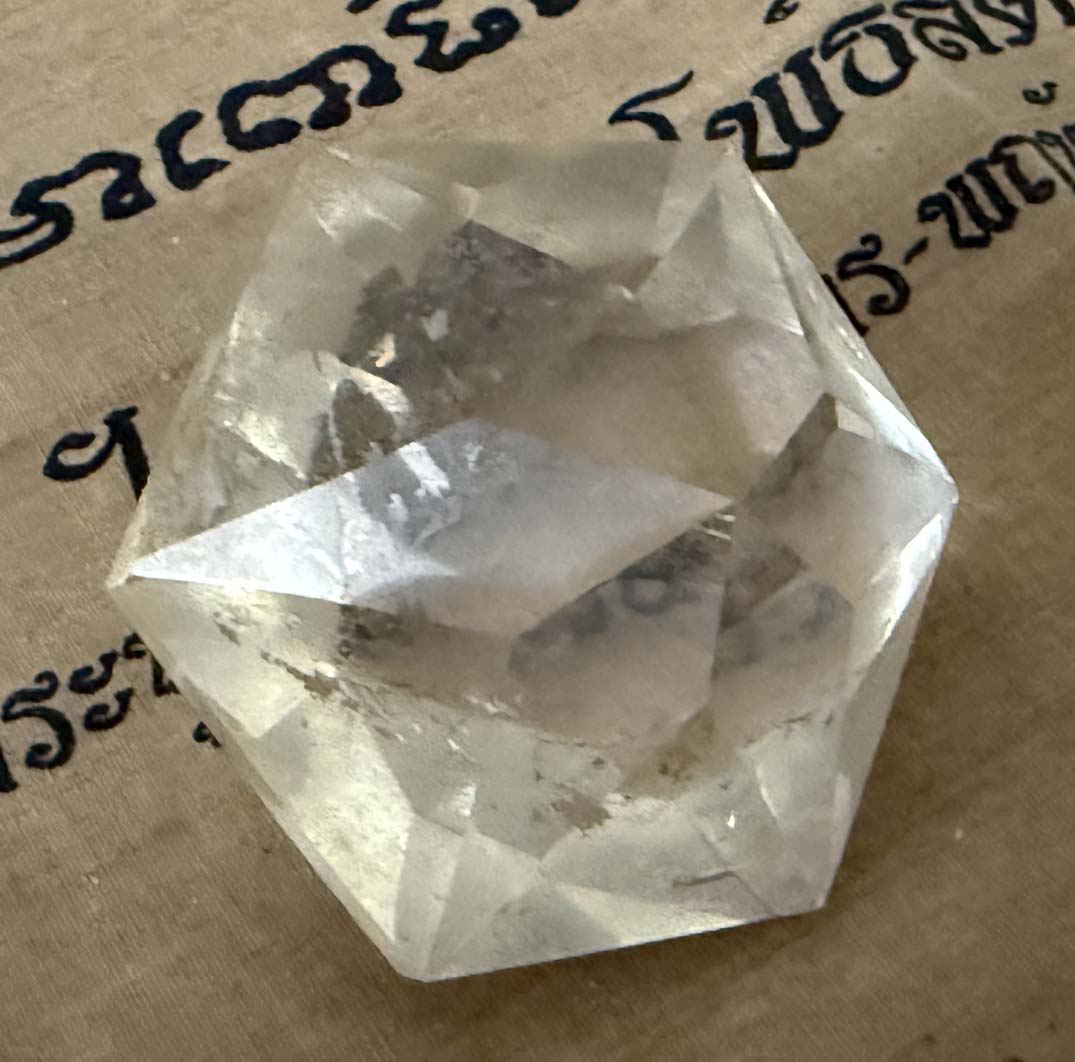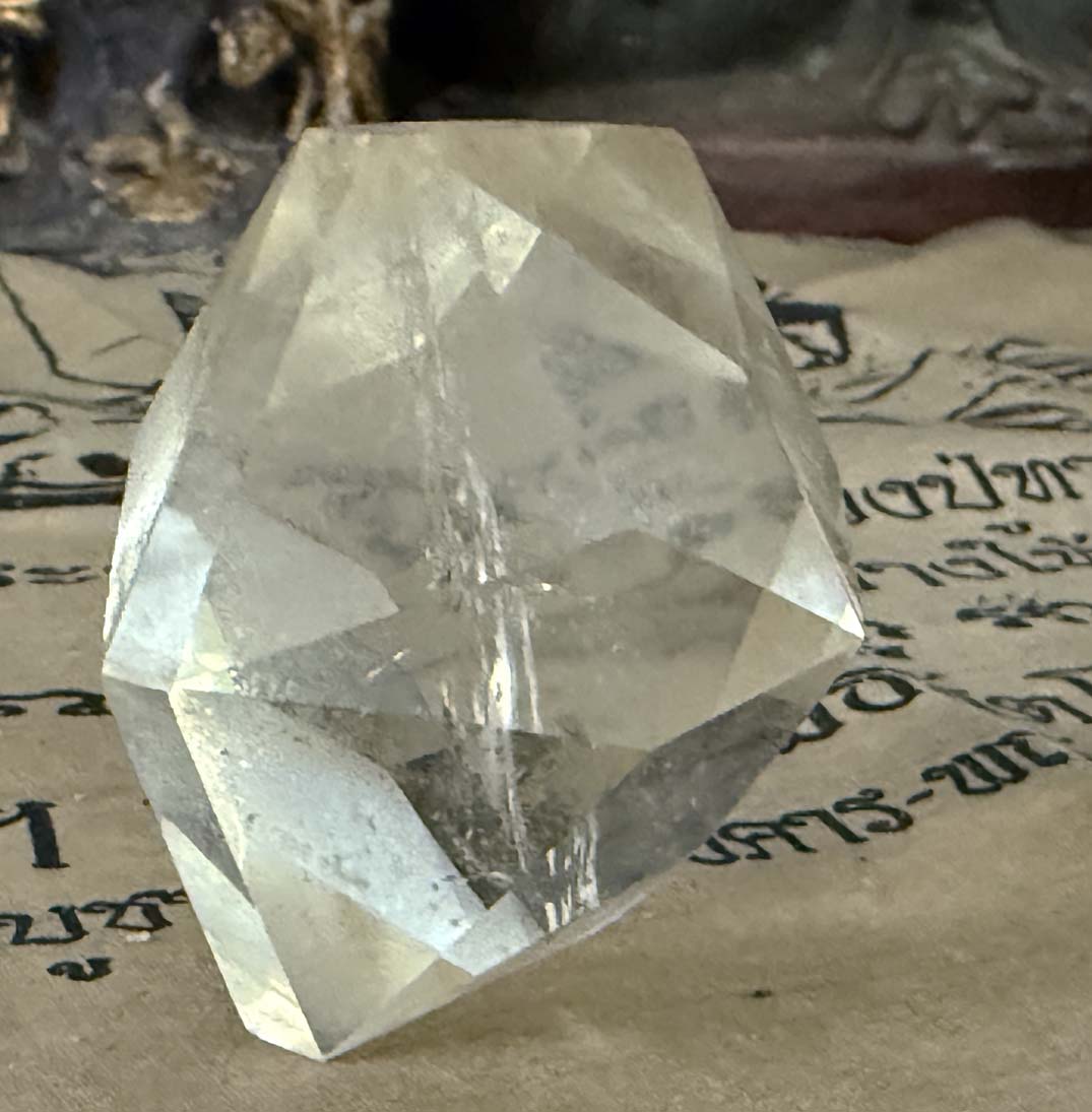 Examination reveals an unusual 58.7375 x 58.7375 x 50.8 mm, 835.94 ct., faceted hexagonal dipyramid rock quartz crystal gem which displays phantom cluster veil inclusions and 92% clarity throughout.The angles of the crystal faces of this formation are those of a generator or Merlin crystal as the energy emits from its centrally located points which are in excellent condition.