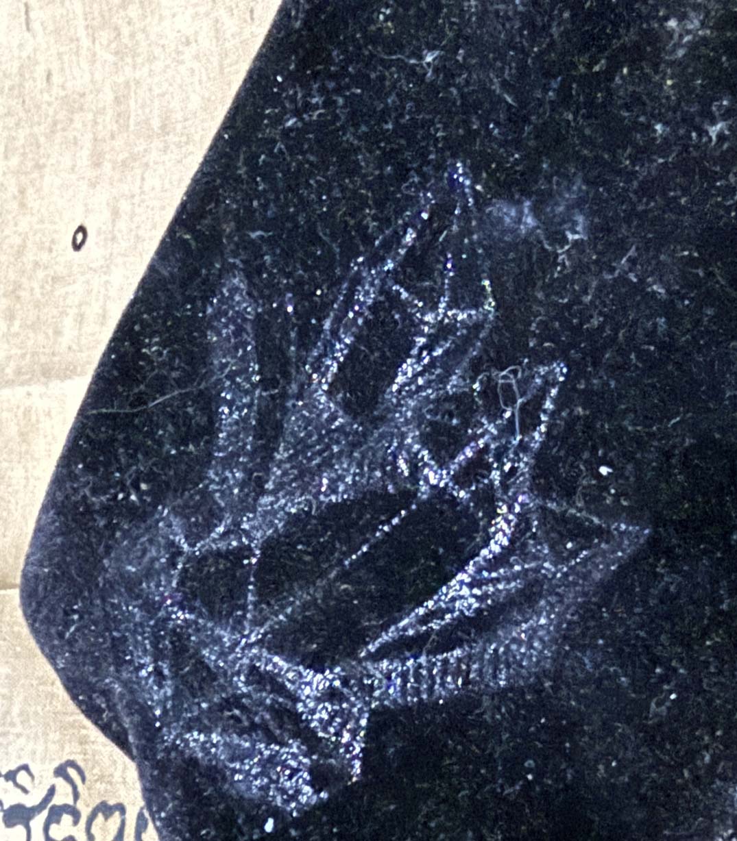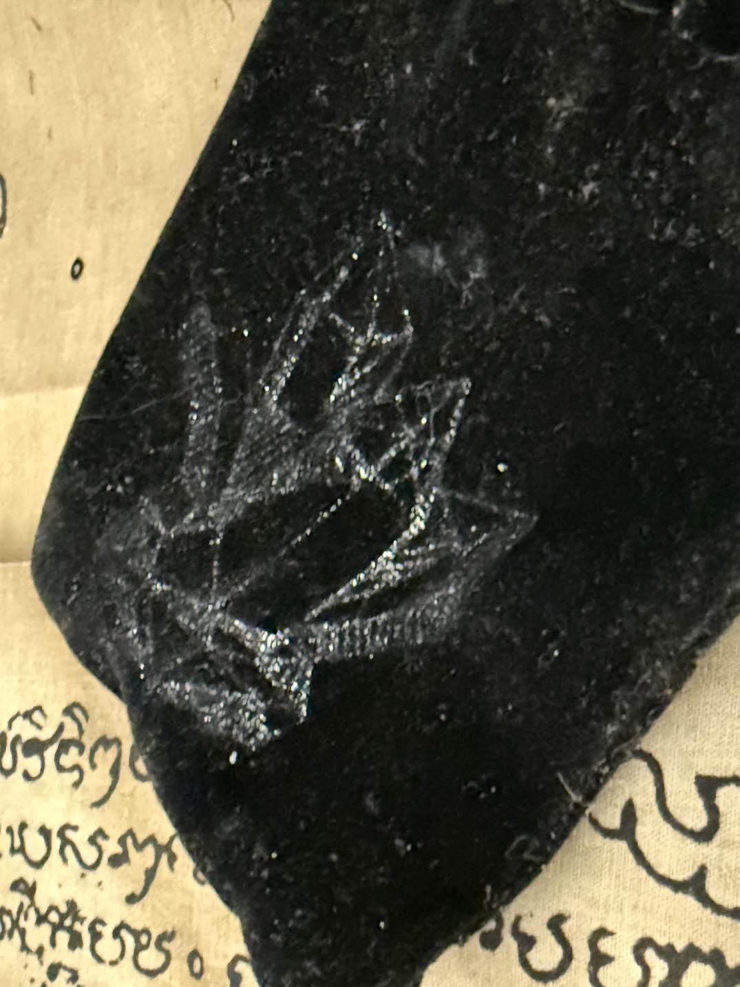 Found in and recovered from what was named, "The Black Pyramid Vèvé Room." This room was an interesting work of concealment architecture. Windowless and located just above the Main Ballroom in the center of the mansion, it was only accessible through a trapdoor and cast iron spiral staircase from the storage room above it. The floor was four feet below the Main Ballroom ceiling, well concealed by the baroque architecture. The architect had concealed the room in the floor above by surrounding it with four guest suites, it was dead center in the mansion.
