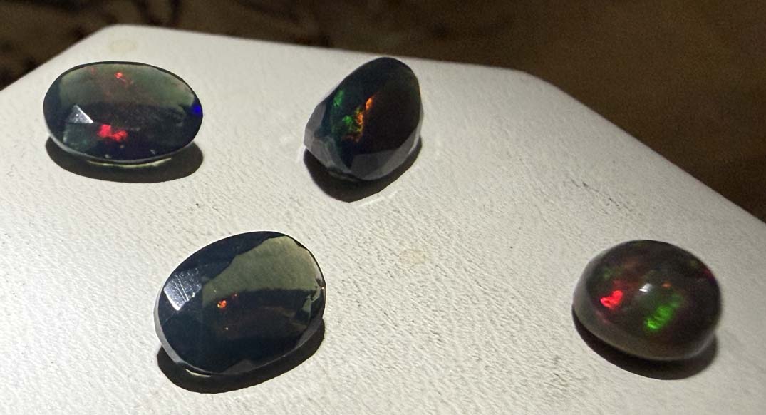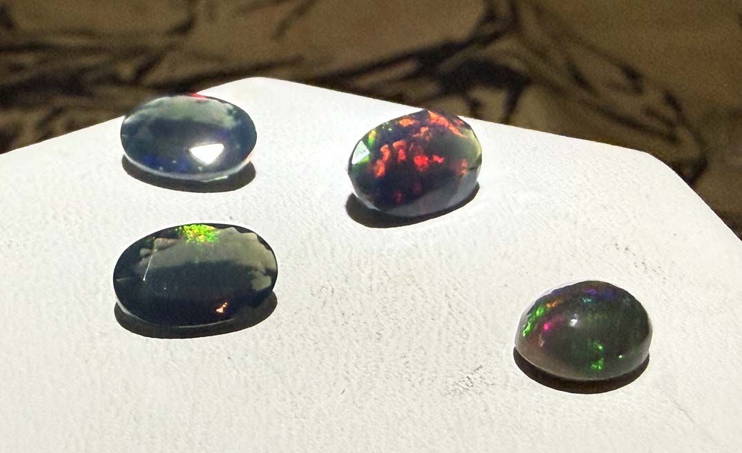 This lot consists of a single 7.9375 x 6.35 x 4.7625 mm, 1.37 ct. high oval cabochon of fine grind and polish, a 9.525 x 6.35 x 4.7625 mm, 1.22 ct., a 9.525 x 6.35 x 3.175 mm, 0.81 ct., and a 11.1125 x 6.35 x 6.35 mm, 1.89 ct., faceted oval gems of fine cut and polish. All display a brilliant internal multi-color flash under single sourced light that has not been adequately captured by the photographer. The lot is 5.29 tcw.